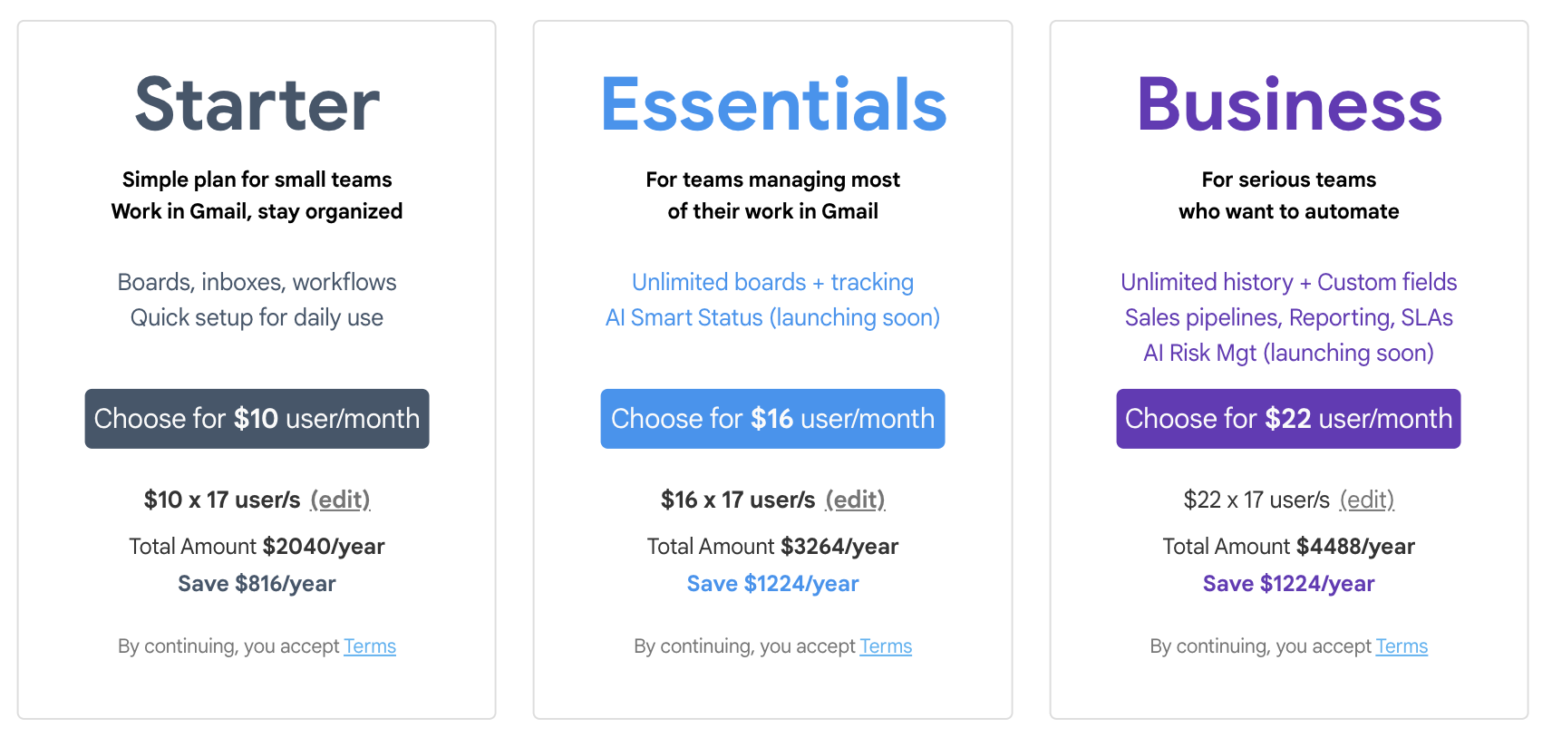 There are 3 tiers:- Starter, Essentials and Business, all of which are priced on a per user basis billed as a monthly or annual subscription. The Starter plan is designed for individuals who don't work in a team, Essentials covers simple use cases for teams, and Business allows for more advanced automation and AI.